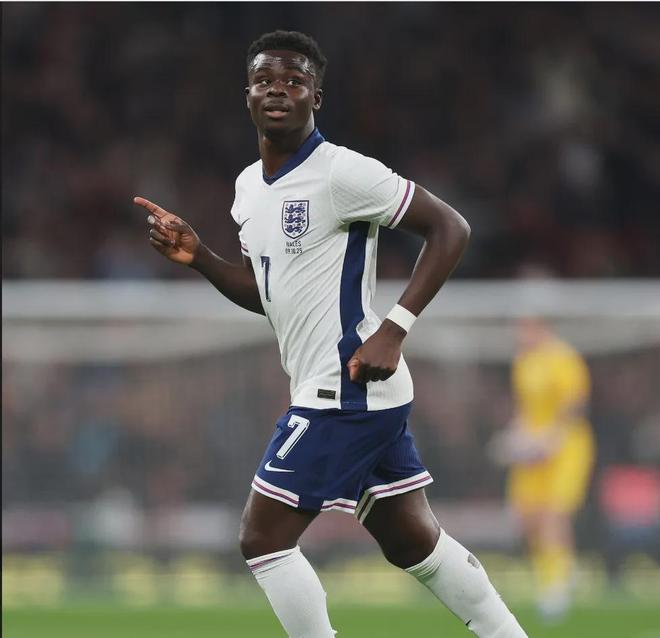 薩卡在英格蘭對(duì)威爾士的友誼賽中打進(jìn)了球隊(duì)的第三球。